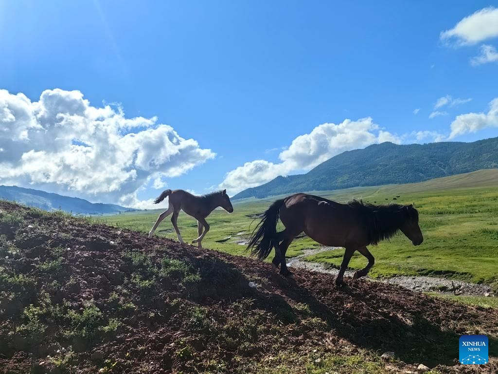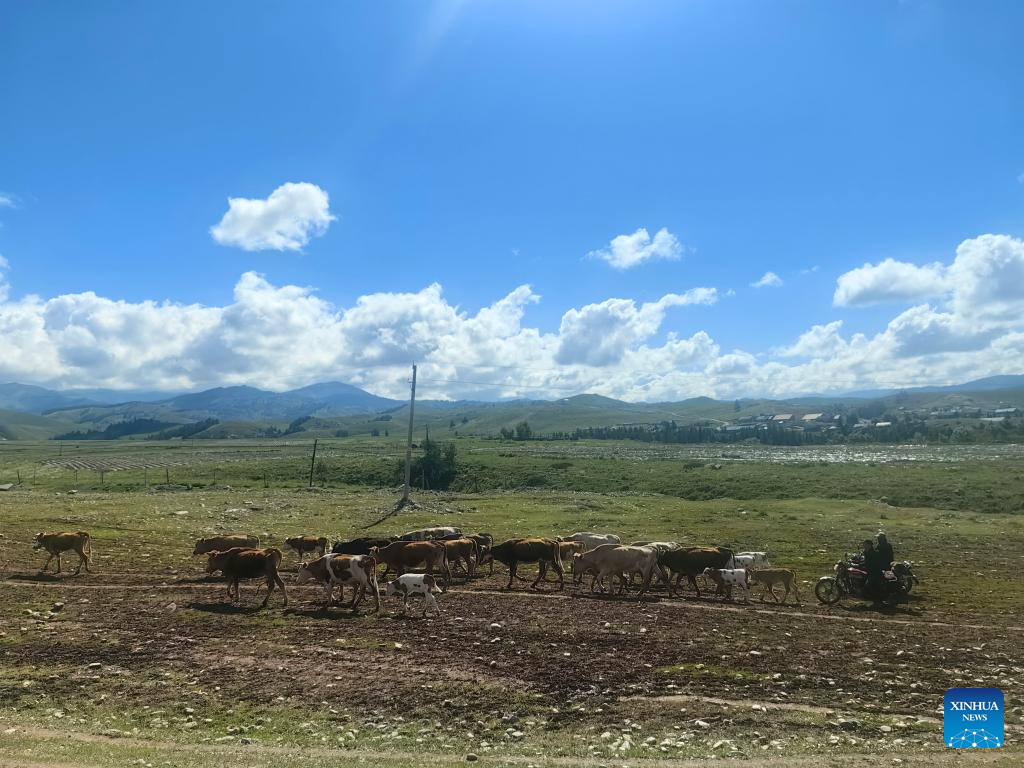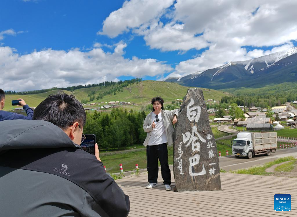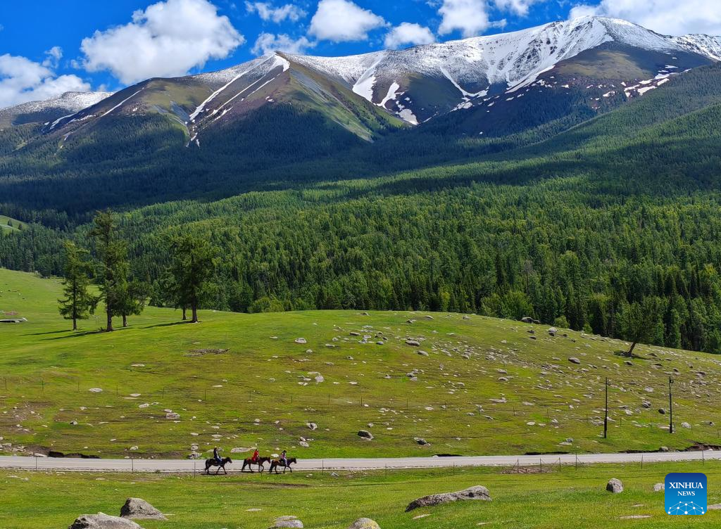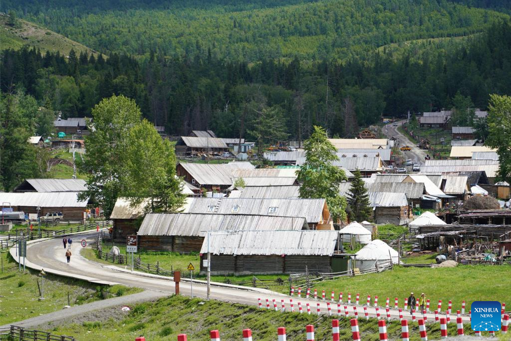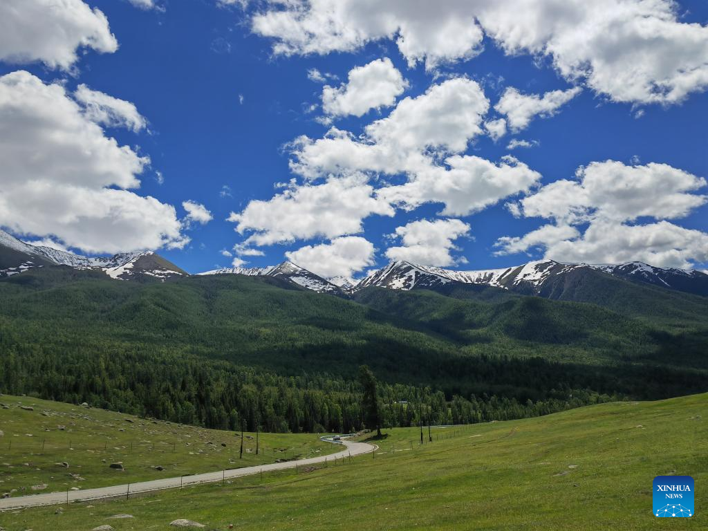 This photo taken on June 4, 2024 shows the scenery of Habahe County in Altay, northwest China's Xinjiang Uygur Autonomous Region. According to the statistics of local authorities, Altay received 4.15 million tourist trips in May, which generated 3.65 billion yuan (about 504 million U.S. dollars) in tourism revenue, up 60.81 percent and 88.25 percent year-on-year respectively. (Xinhua/Zhang Yu)