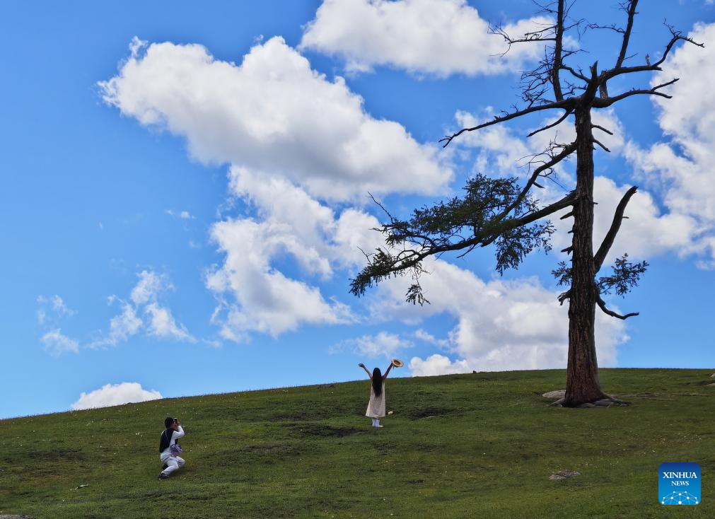 A tourist poses for photos under a tree in Habahe County of Altay, northwest China's Xinjiang Uygur Autonomous Region on June 4, 2024. According to the statistics of local authorities, Altay received 4.15 million tourist trips in May, which generated 3.65 billion yuan (about 504 million U.S. dollars) in tourism revenue, up 60.81 percent and 88.25 percent year-on-year respectively. (Xinhua/Gou Lifeng)