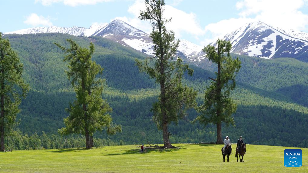 Tourists ride horses in Habahe County of Altay, northwest China's Xinjiang Uygur Autonomous Region on June 4, 2024. According to the statistics of local authorities, Altay received 4.15 million tourist trips in May, which generated 3.65 billion yuan (about 504 million U.S. dollars) in tourism revenue, up 60.81 percent and 88.25 percent year-on-year respectively. (Xinhua/Aman)