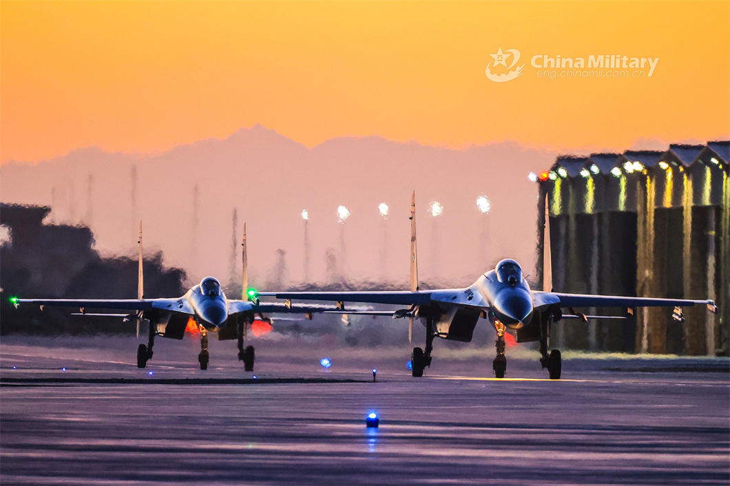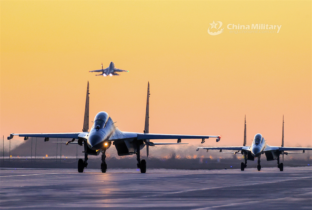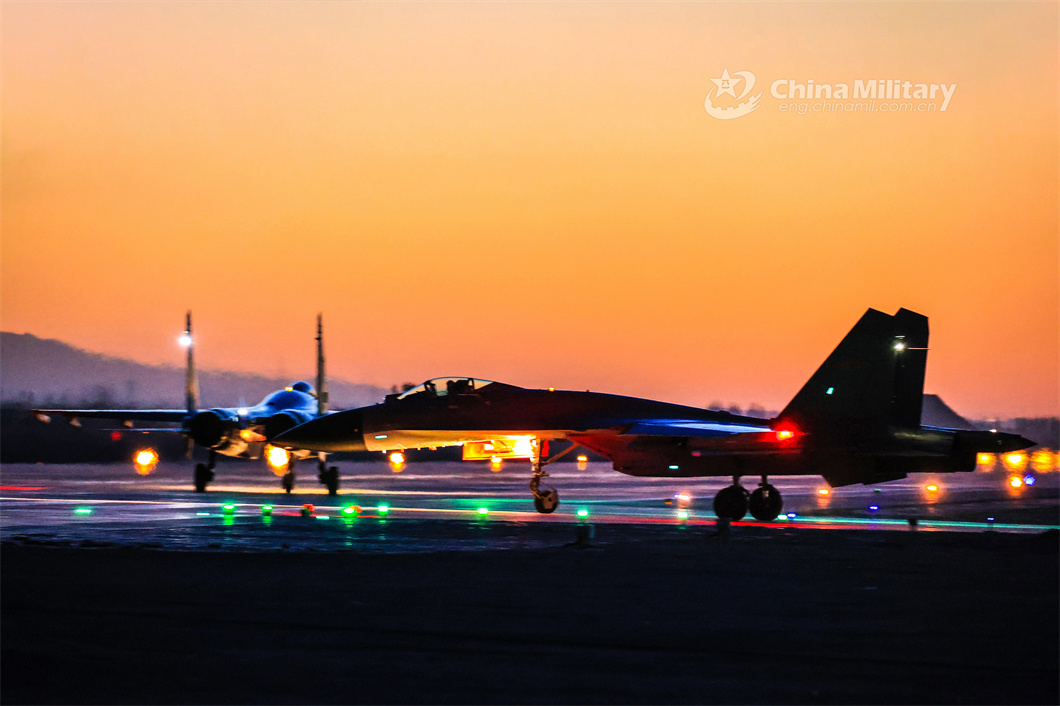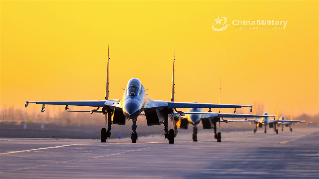 Fighter jets attached to an aviation brigade of the PLA Air Force taxi on the runway for a flight training exercise in early May 2024. (eng.chinamil.com.cn/Photo by Cui Baoliang)