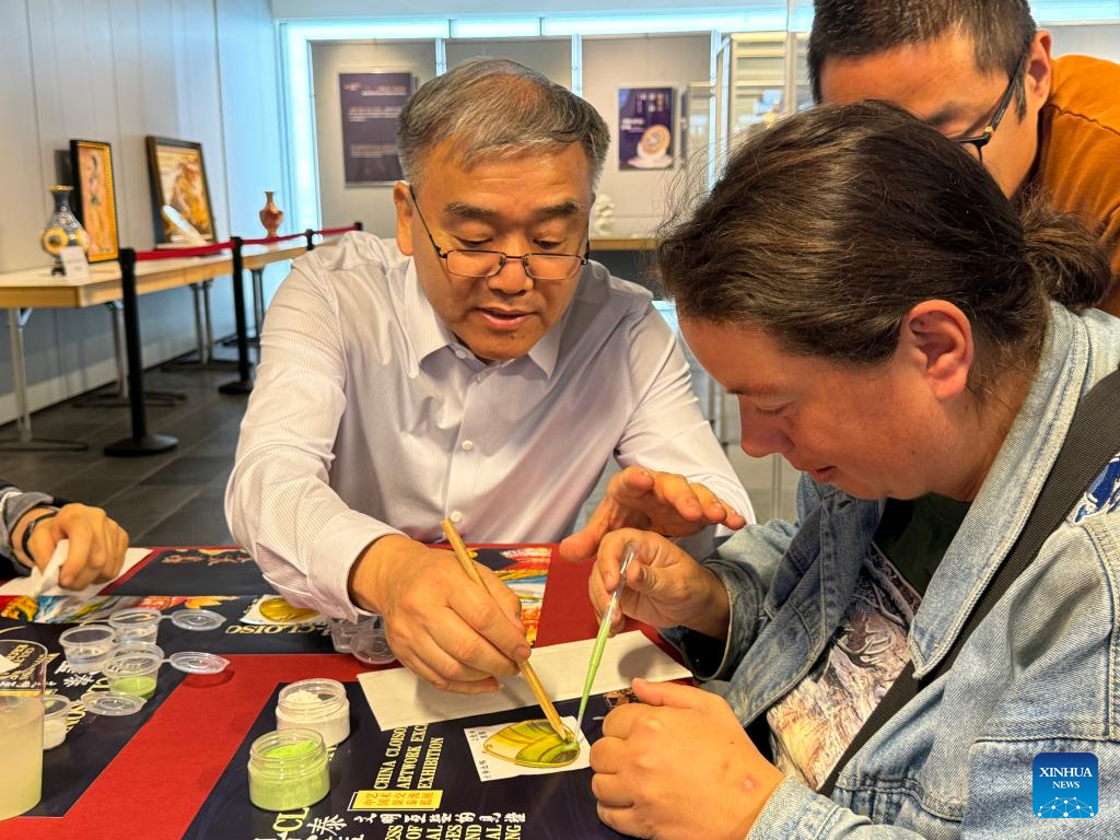 Chinese cloisonne craftswoman Gao Lili (L) helps guests make enamel ornaments at the China Cultural Center during an exchange exhibition on Chinese cloisonne in Berlin, Germany, June 6, 2024. (Xinhua/Tai Sicong)