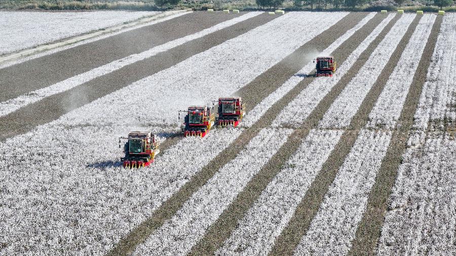 An aerial drone photo taken on Oct. 12, 2023 shows machines harvesting cotton in Korla, northwest China's Xinjiang Uygur Autonomous Region. (Xinhua/Li Xiang)