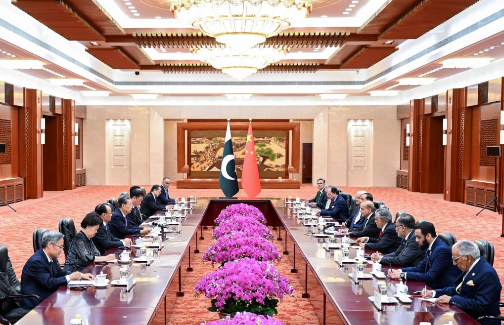 Zhao Leji, chairman of the National People's Congress (NPC) Standing Committee, meets with Pakistani Prime Minister Shehbaz Sharif in Beijing, capital of China, June 7, 2024. (Xinhua/Zhang Ling)