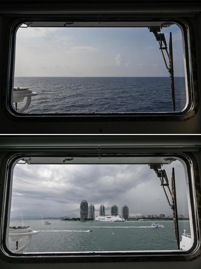 This combo photo shows a view of the South China Sea on May 23, 2024 (above), and a view of Sanya City of south China's Hainan Province on May 15, 2024, as seen from the window of China Coast Guard vessel Huayang. (Xinhua/Pu Xiaoxu)