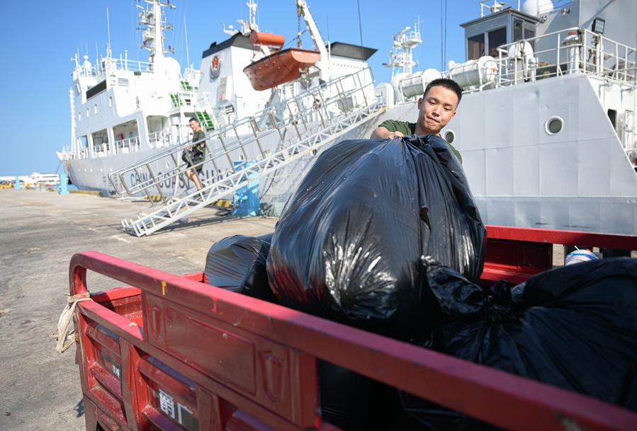 A law enforcer carries the garbage generated at sea from China Coast Guard vessel Huayang after patrolling the waters of China's Ren'ai Jiao and returning to Sanya City of south China's Hainan Province, May 15, 2024. (Xinhua/Pu Xiaoxu)