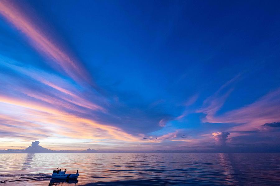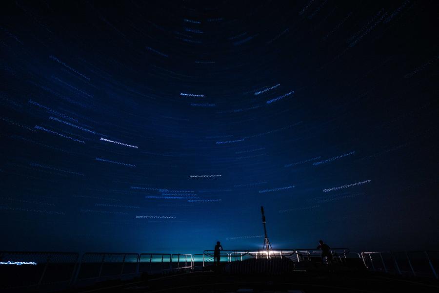 This photo taken on April 3, 2024 shows the star trails seen from China Coast Guard vessel Huayang patrolling the waters of China's Ren'ai Jiao. (Xinhua/Pu Xiaoxu)