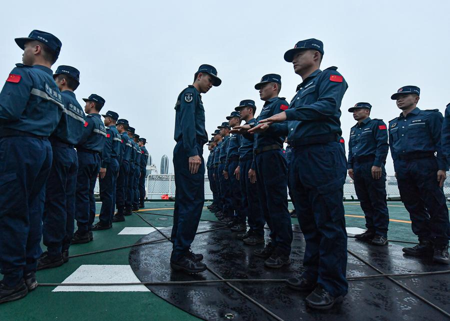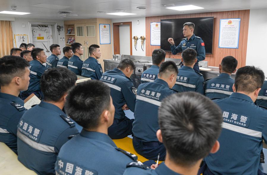 Law enforcers attend a course on China Coast Guard vessel Huayang patrolling the waters of China's Ren'ai Jiao, April 30, 2024. (Xinhua/Pu Xiaoxu)