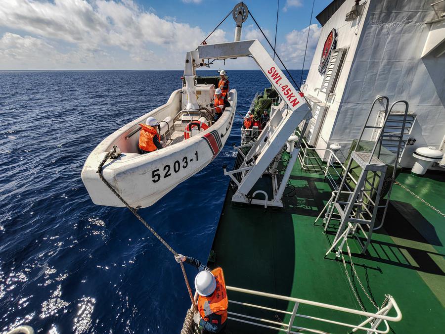 Law enforcers lift a boat to the sea for training on China Coast Guard vessel Huayang patrolling the waters of China's Ren'ai Jiao, April 2, 2024. (Xinhua/Pu Xiaoxu)
