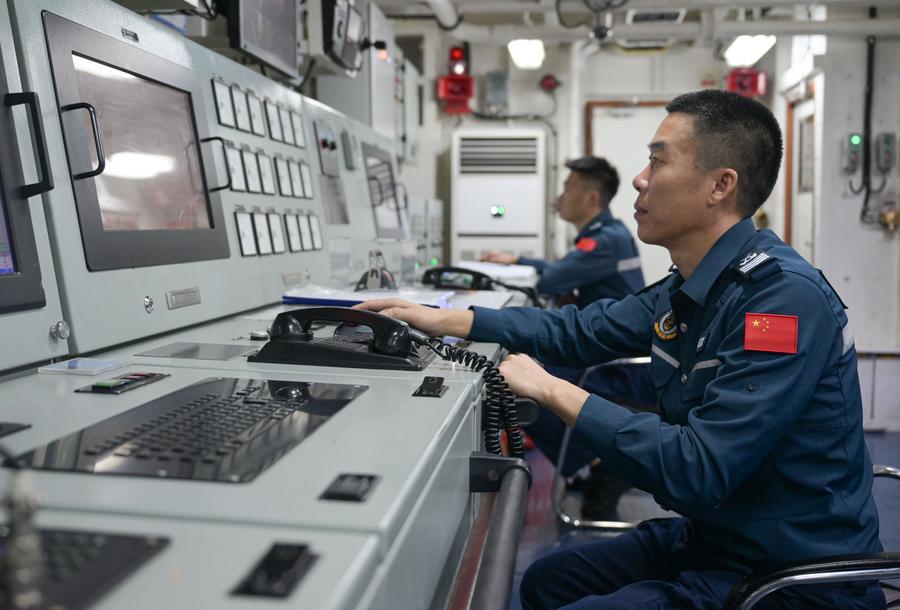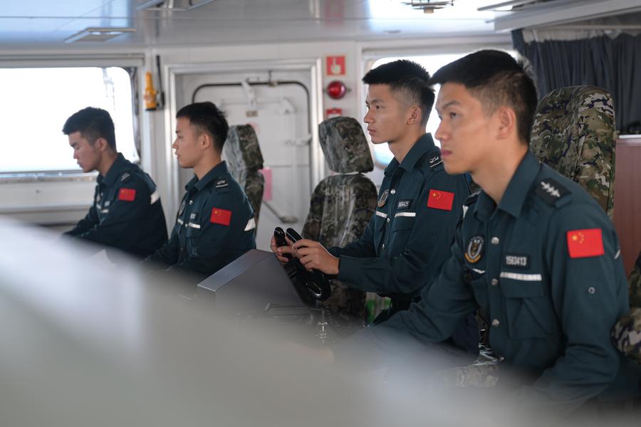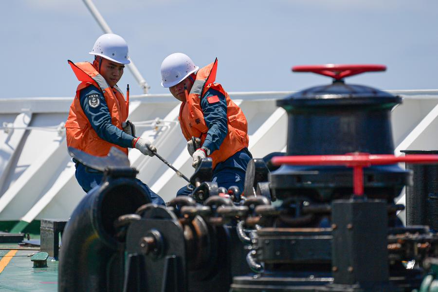 Law enforcers are on duty on China Coast Guard vessel Huayang patrolling the waters of China's Ren'ai Jiao, April 22, 2024. (Xinhua/Pu Xiaoxu)