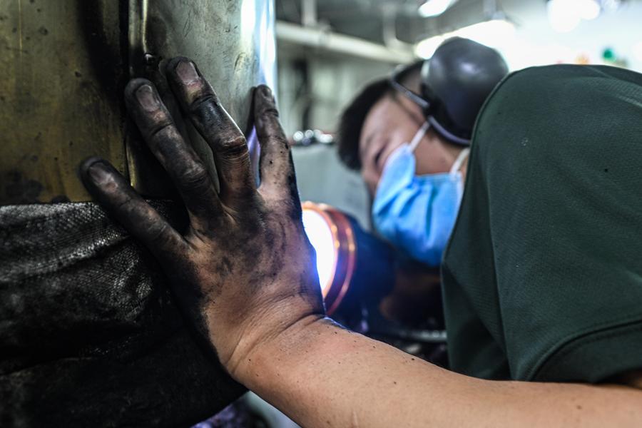 A law enforcer overhauls equipment in the engine room on China Coast Guard vessel Huayang patrolling the waters of China's Ren'ai Jiao, April 29, 2024. (Xinhua/Pu Xiaoxu)