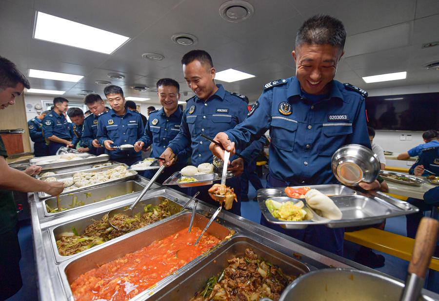Law enforcers line up to get meal on China Coast Guard vessel Huayang patrolling the waters of China's Ren'ai Jiao, April 21, 2024. (Xinhua/Pu Xiaoxu)