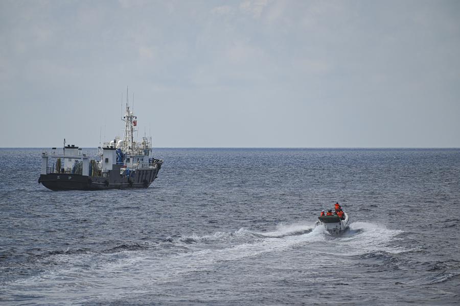 Law enforcers of China Coast Guard inspect a nearby fishing boat in the waters of China's Ren'ai Jiao, April 2, 2024. (Xinhua/Pu Xiaoxu)