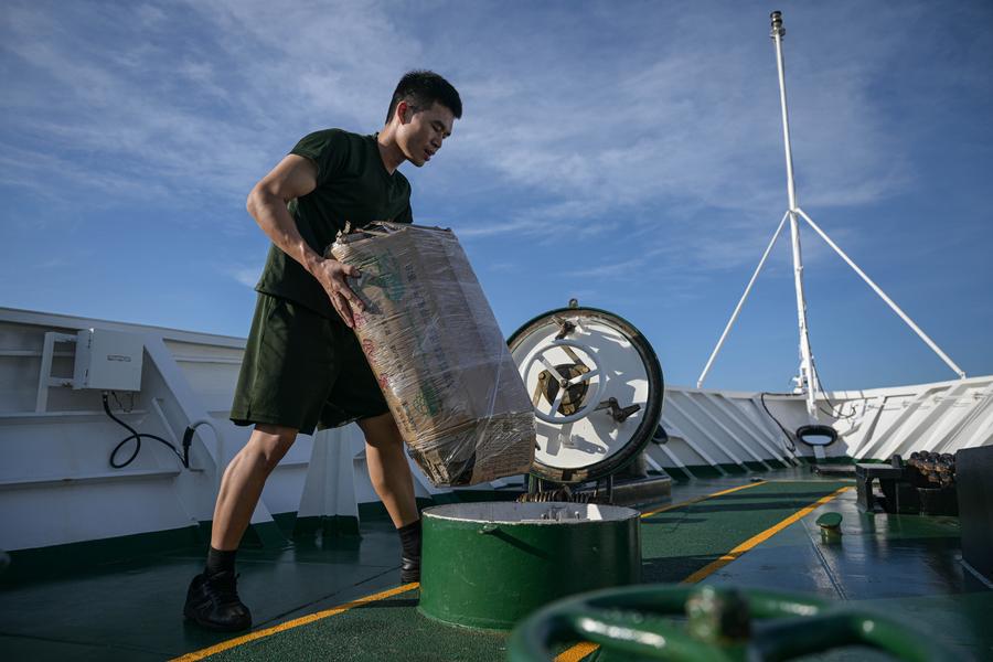A law enforcer handles a package of garbage on China Coast Guard vessel Huayang patrolling the waters of China's Ren'ai Jiao, April 25, 2024. (Xinhua/Pu Xiaoxu)