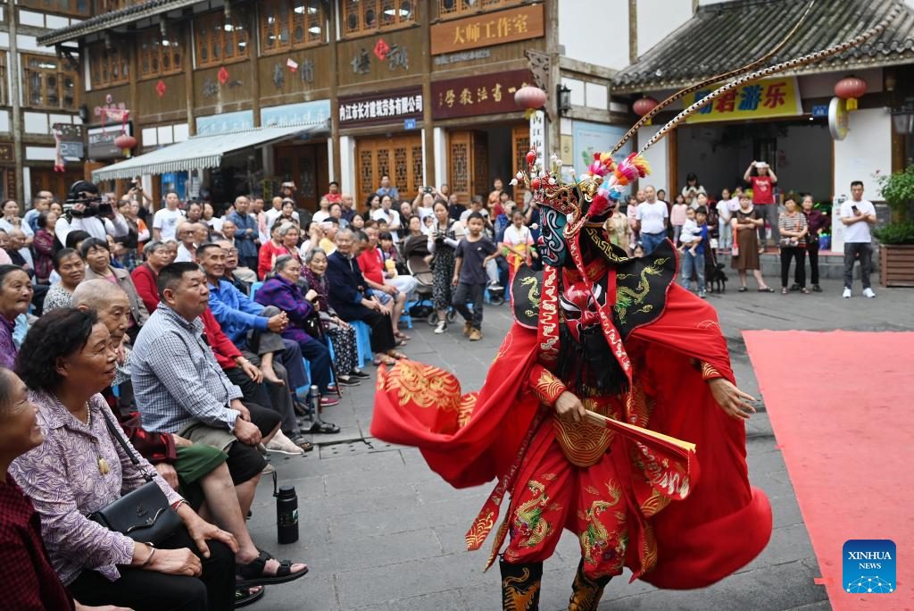 Tourists enjoy the face-changing performance of Sichuan Opera in Neijiang, southwest China's Sichuan Province, June 9, 2024. People enjoy the 3-day holiday of the Dragon Boat Festival, also called Duanwu Festival, which falls on June 10 this year, via various activities across the country. (Photo by Tang Mingrun/Xinhua)