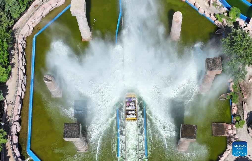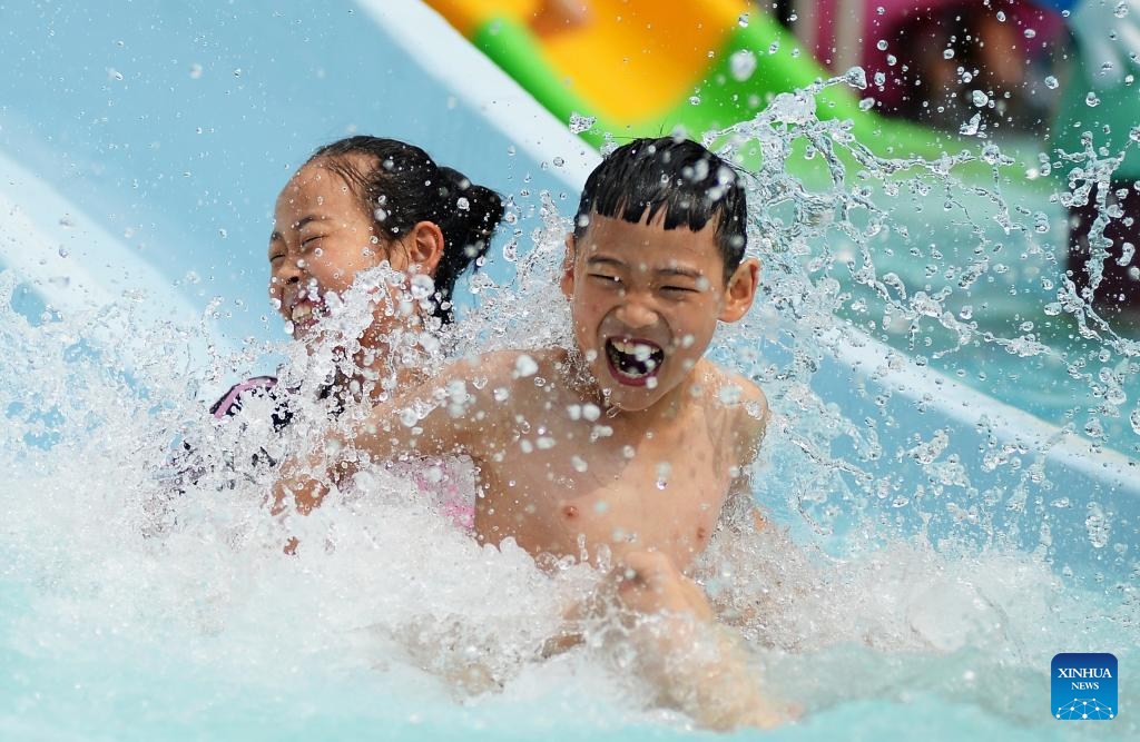 Children play at a water park in Tengzhou, east China's Shandong Province, June 9, 2024. People enjoy the 3-day holiday of the Dragon Boat Festival, also called Duanwu Festival, which falls on June 10 this year, via various activities across the country. (Photo by Li Zhijun/Xinhua)