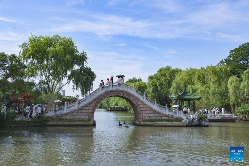 Tourists visit the Slender West Lake scenic spot in Yangzhou, east China's Jiangsu Province, June 10, 2024. China saw 110 million domestic tourist trips made during the three-day Dragon Boat Festival holiday, up 6.3 percent from the same period last year, the Ministry of Culture and Tourism said Monday. (Photo by Ren Fei/Xinhua)