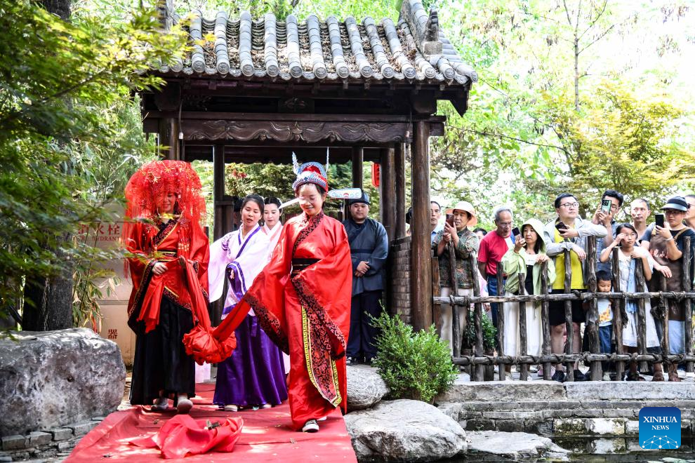 Tourists watch a traditional wedding performance at a scenic area in Jiyuan City, east China's Shandong Province, June 10, 2024. China saw 110 million domestic tourist trips made during the three-day Dragon Boat Festival holiday, up 6.3 percent from the same period last year, the Ministry of Culture and Tourism said Monday. (Photo by Miao Qiunao/Xinhua)