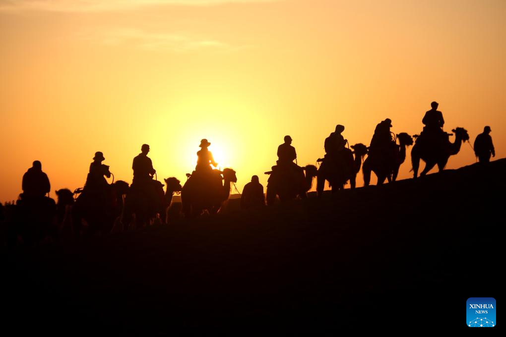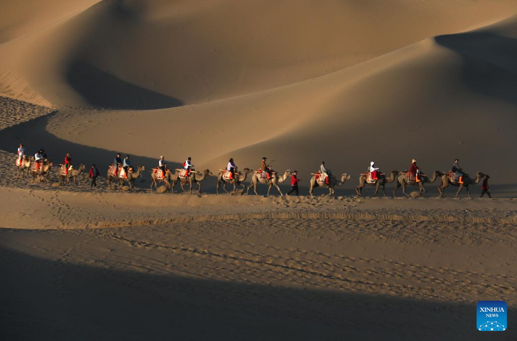 Tourist ride camels at the Mingshashan and the Crescent Lake, an oasis scenic spot in the Gobi Desert in Dunhuang, northwest China's Gansu Province, June 9, 2024. China saw 110 million domestic tourist trips made during the three-day Dragon Boat Festival holiday, up 6.3 percent from the same period last year, the Ministry of Culture and Tourism said Monday. (Photo by Zhang Xiaoliang/Xinhua)
