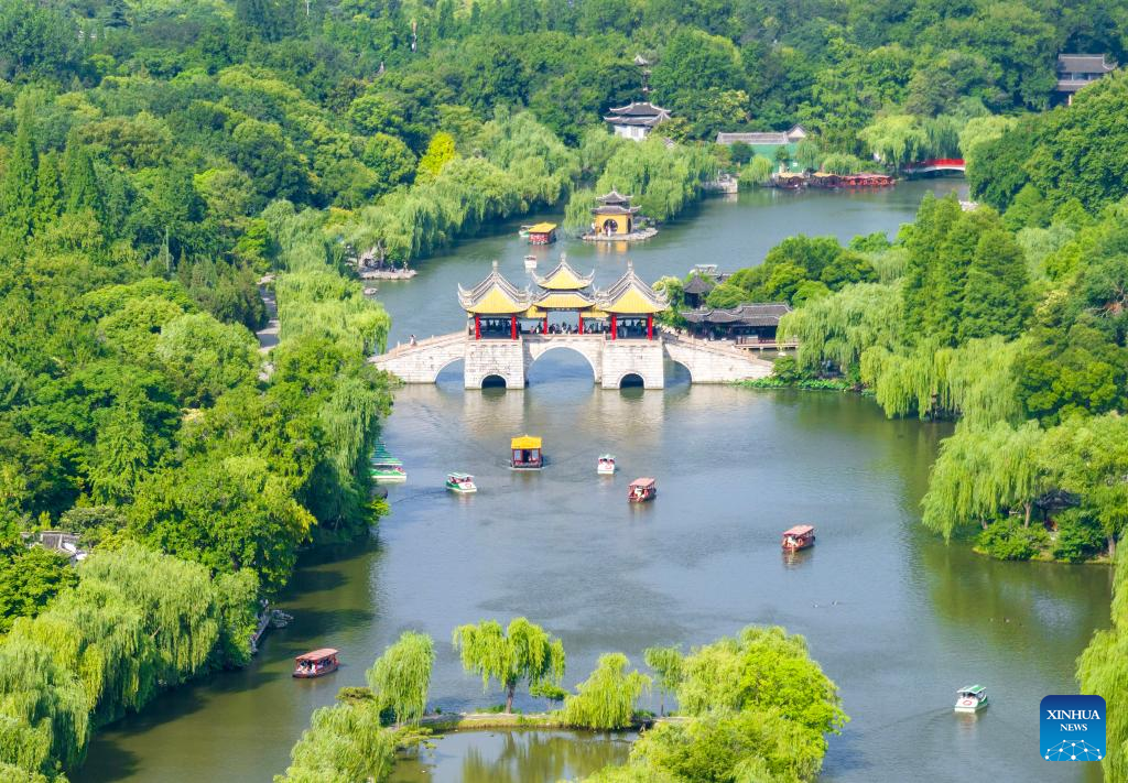 An aerial drone photo shows tourists visiting the Slender West Lake scenic spot in Yangzhou, east China's Jiangsu Province, June 10, 2024. China saw 110 million domestic tourist trips made during the three-day Dragon Boat Festival holiday, up 6.3 percent from the same period last year, the Ministry of Culture and Tourism said Monday. (Photo by Zhou Shegen/Xinhua)