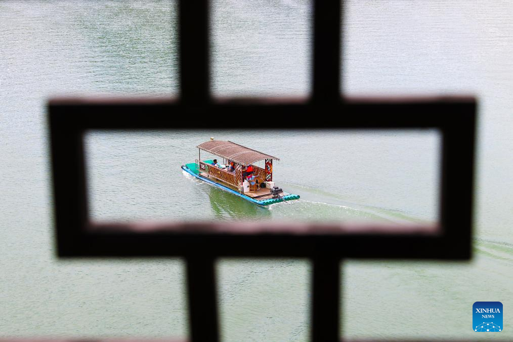 Tourists on a bamboo raft visit Zhuoshui ancient town in Qianjiang District of southwest China's Chongqing, June 10, 2024. China saw 110 million domestic tourist trips made during the three-day Dragon Boat Festival holiday, up 6.3 percent from the same period last year, the Ministry of Culture and Tourism said Monday. (Photo by Yang Min/Xinhua)