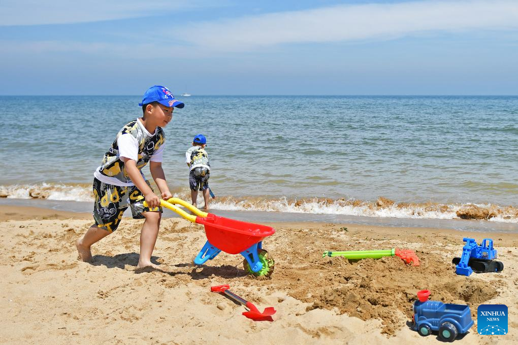 Children have fun at a beach in Yantai, east China's Shandong Province, June 10, 2024. China saw 110 million domestic tourist trips made during the three-day Dragon Boat Festival holiday, up 6.3 percent from the same period last year, the Ministry of Culture and Tourism said Monday. (Photo by Sun Wentan/Xinhua)