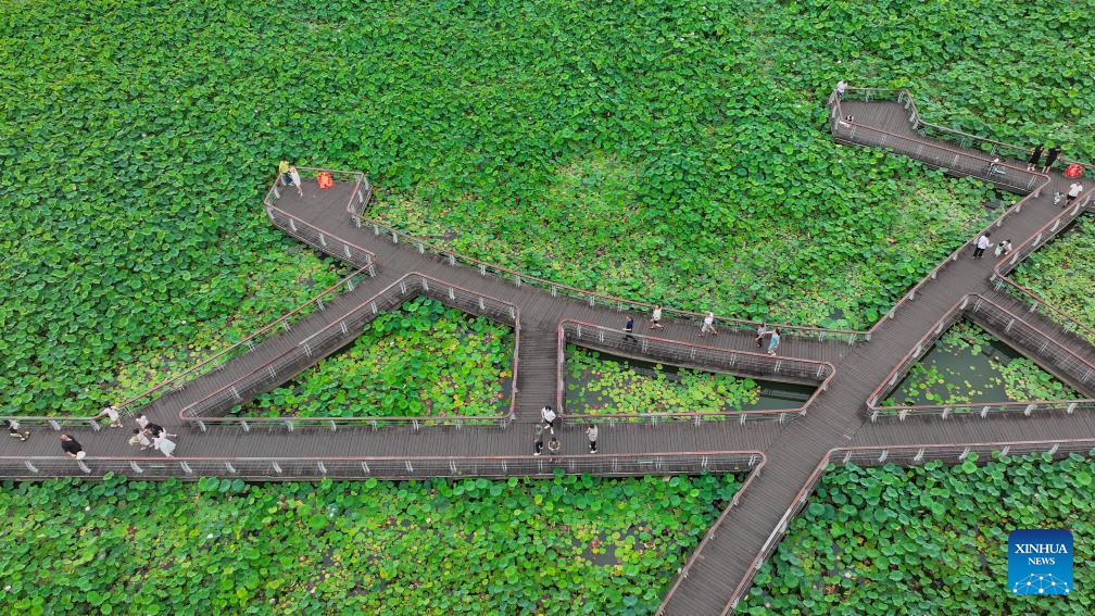 An aerial drone photo shows tourists viewing lotus in Suining City, southwest China's Sichuan Province, June 10, 2024. China saw 110 million domestic tourist trips made during the three-day Dragon Boat Festival holiday, up 6.3 percent from the same period last year, the Ministry of Culture and Tourism said Monday. (Photo by Liu Changsong/Xinhua)