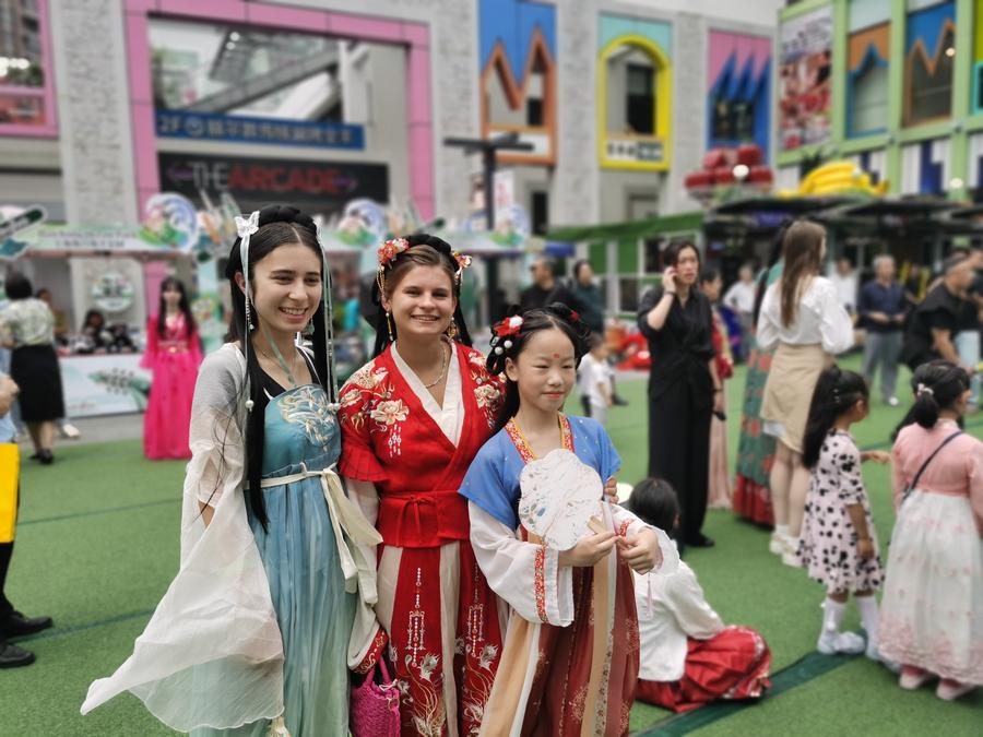 In Xi'an, a popular sightseeing destination in northwest China's Shaanxi Province, tourists wearing Hanfu decorated with intricate embroidery could be seen taking pictures in front of the Bell Tower, a key landmark built in 1384.