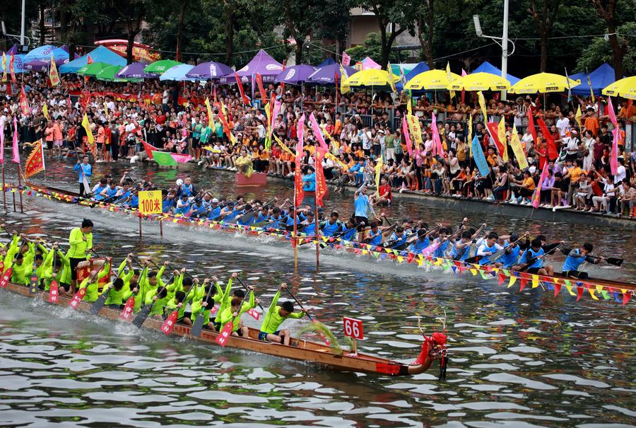 BEIJING, June 10 (Xinhua) -- Despite the sticky weather, teams on dragon-headed vessels in south China's Guangdong Province sliced cleanly through the water once the whistle sounded. The beat of drums reverberated in the air and the audience could be heard cheering around the lake.