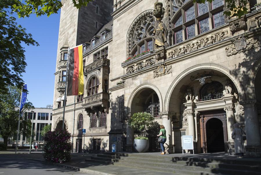 A voter walks out of a polling station at the city hall for the European Parliament elections in Duisburg, Germany, June 9, 2024. (Xinhua/Zhang Fan)