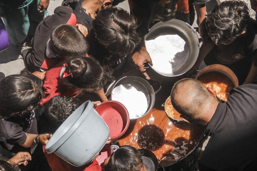 People receive food relief at Jabalia refugee camp in the northern Gaza Strip city of Jabalia, on June 8, 2024. (Photo by Mahmoud Zaki/Xinhua)