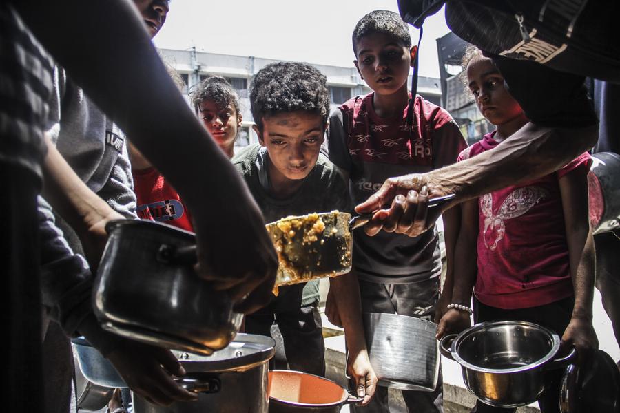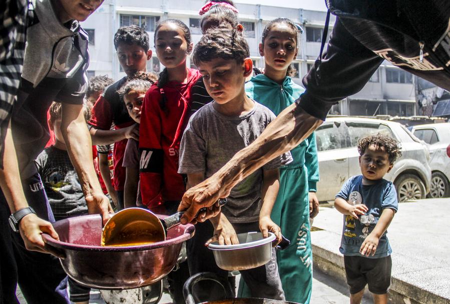 Children receive food relief at Jabalia refugee camp in the northern Gaza Strip city of Jabalia, on June 8, 2024. (Photo by Mahmoud Zaki/Xinhua)