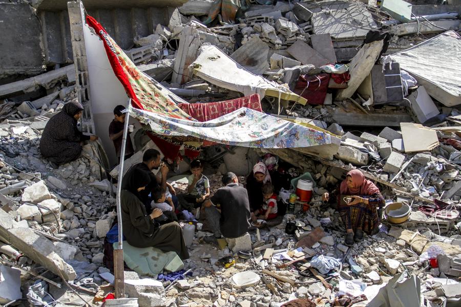 Palestinians are seen on the rubble of their house in the Jabalia refugee camp in the northern Gaza Strip, on June 5, 2024. (Photo by Mahmoud Zaki/Xinhua)