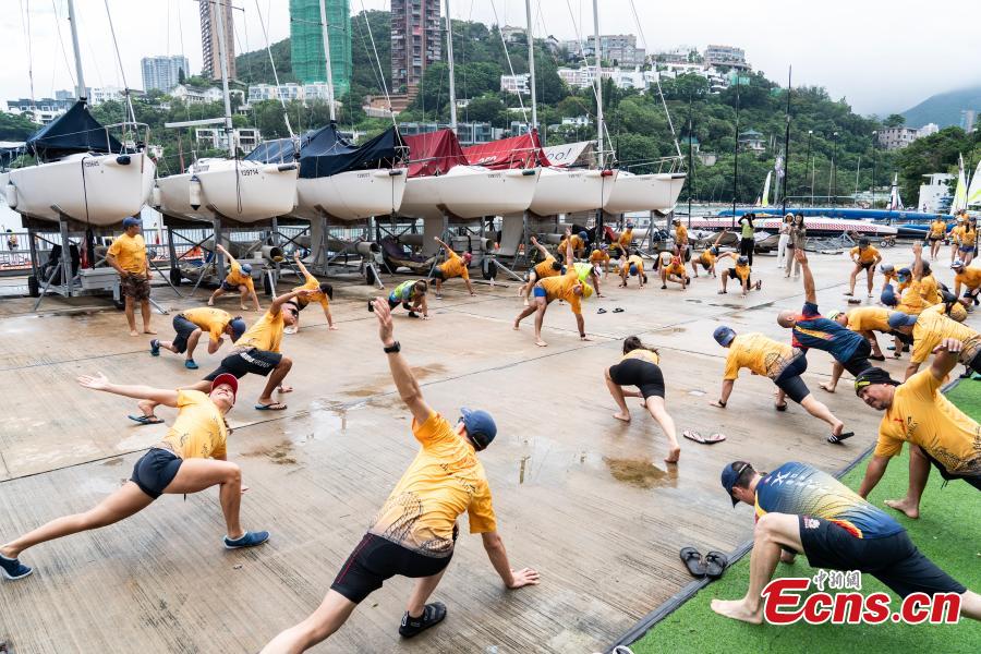 Royal X dragon boat team members warm up together before getting onboard at Deep Water Bay in Hong Kong. (Photo: China News Service/ Hou Yu)