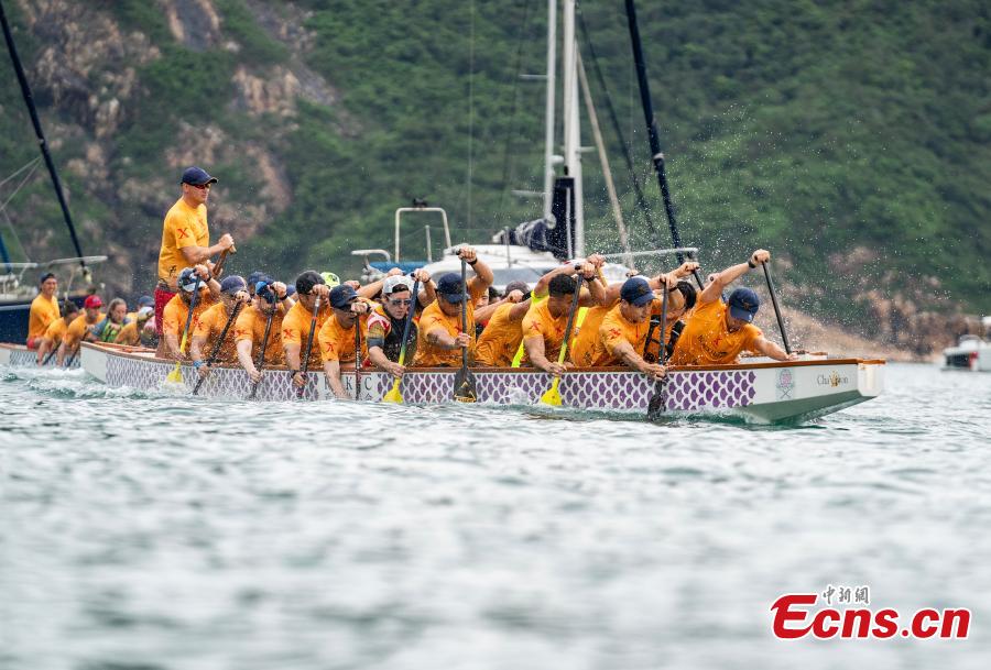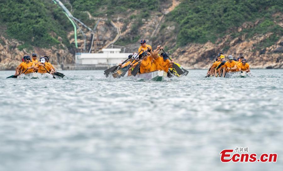 This photo released on June 10, 2024, shows Royal X dragon boat team members paddle hard during a training session for the 2024 Hong Kong International Dragon Boat Races at Deep Water Bay in Hong Kong. (Photo: China News Service/ Hou Yu)