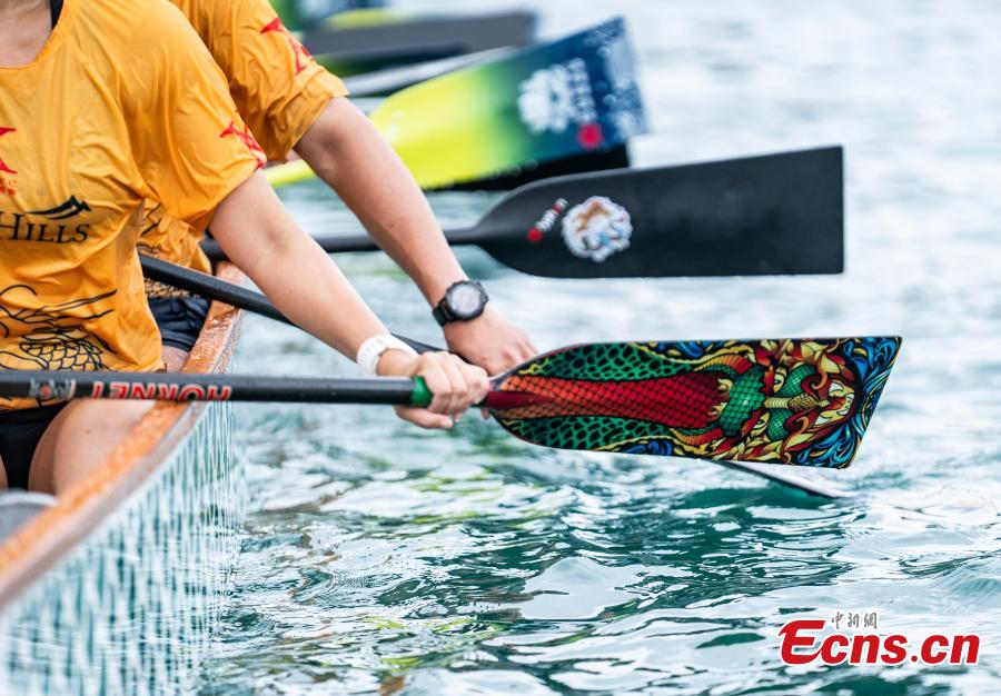 Royal X dragon boat team members take a number of dragon boats for racing training. (Photo: China News Service/ Hou Yu)