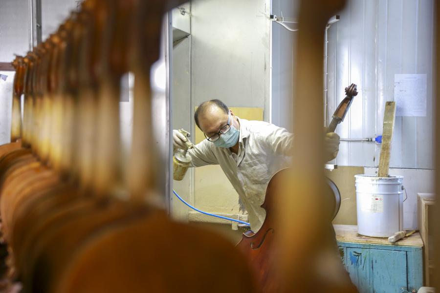 A worker arranges violins at a workshop in Huangqiao Town of Taixing, east China's Jiangsu Province, Nov. 3, 2020. (Photo by Tang Dehong/Xinhua)