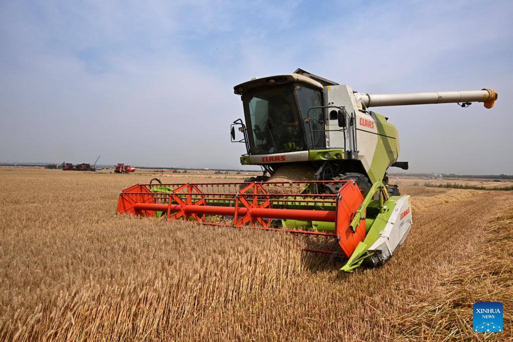 A combine harvester reaps wheat in a field in Dachang town of Xihai'an (West Coast) New Area in Qingdao, East China's Shandong province, June 11, 2024. (Photo/Xinhua)