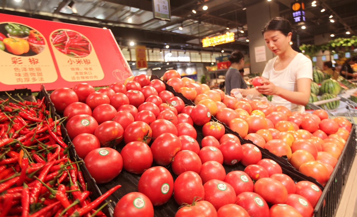 A consumer selects tomatoes at a supermarket in Linyi city, East China's Shandong province on June 12. [Photo/Xinhua]
