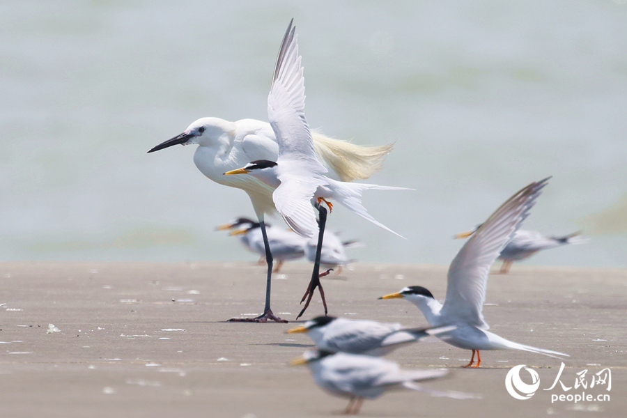 Photo shows terns and herons on an embankment. (People’s Daily Online/Chen Bo)