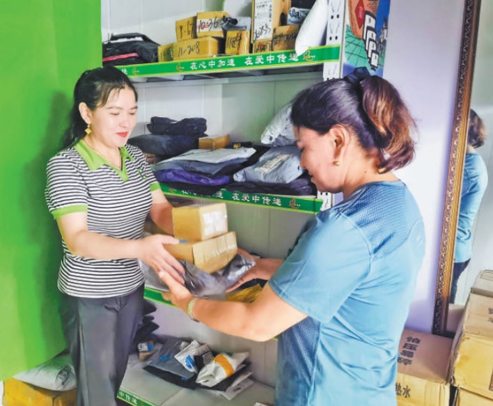 Seytnisa Mamat (right) picks up parcels at a courier station. (Photo provided by the postal administration of Kashgar, Xinjiang Uygur autonomous region)