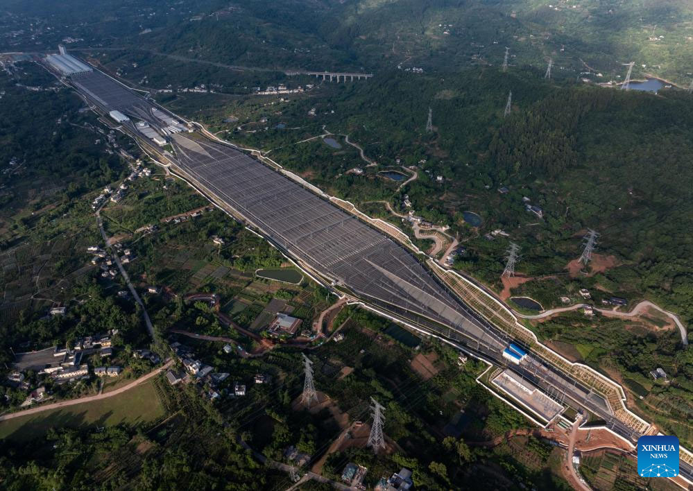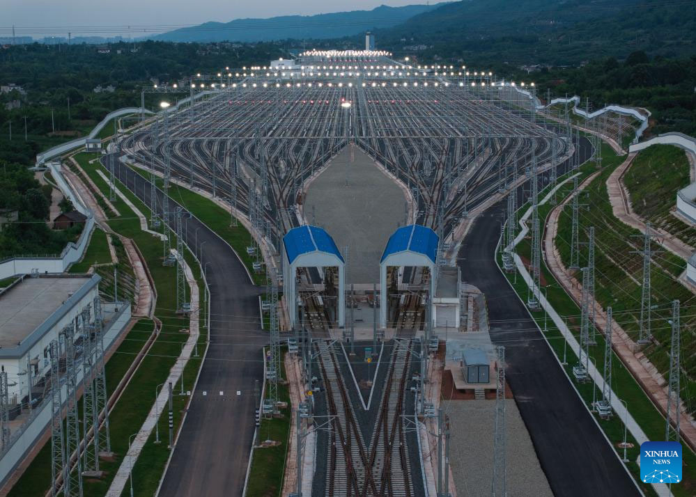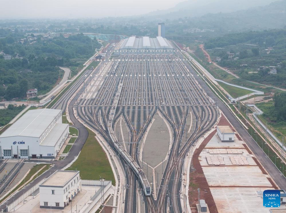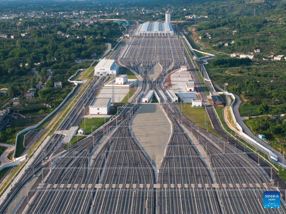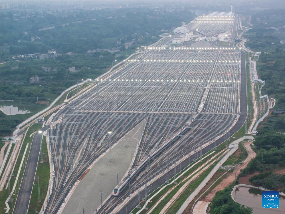 An aerial drone photo taken on June 11, 2024 shows a view of the Tianfu high-speed train maintenance base in Tianfu New Area of Chengdu, southwest China's Sichuan Province. The Tianfu high-speed train maintenance base, covering an area of about 2,090 Mu (about 139 hectares), was put into use here Friday. Jointly constructed by China Railway 19th Bureau Group Co., Ltd. and China Railway Construction Electrification Bureau Group Co., Ltd., the base could undertake the maintenance work of 90 multiple-unit trains per day to its maximum operational capability. (Xinhua/Jiang Hongjing)