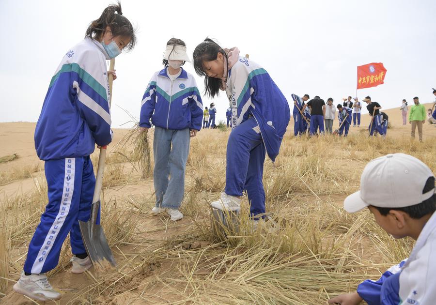 YINCHUAN, June 16 (Xinhua) -- Amid the vast expanse of desert in the Shapotou scenic spot, located in northwest China's Zhongwei City, a group of students watch carefully as their tutor demonstrates the technique of paving straw checkerboard, China's remarkable method for sand control.