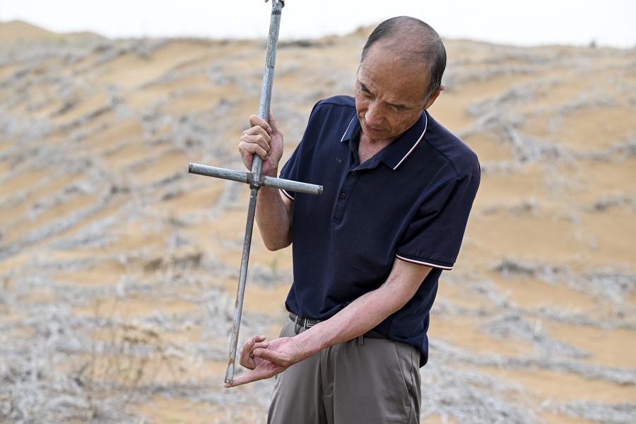 Tang Ximing, a senior engineer at a state-owned forestry farm in Zhongwei, introduces his invention, a steel tool featuring two horizontal bars at the front tip that enables the planting of seedling roots 50 centimeters deep into the moist sand layer, in Zhongwei City, northwest China's Ningxia Hui Autonomous Region, June 1, 2024. (Xinhua/Feng Kaihua)