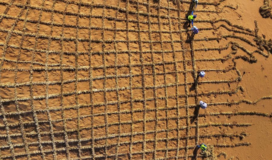 An aerial drone photo taken on May 30, 2024 shows workers paving an enhanced version of straw checkerboards in the Tengger Desert in Zhongwei City, northwest China's Ningxia Hui Autonomous Region. (Xinhua/Feng Kaihua)