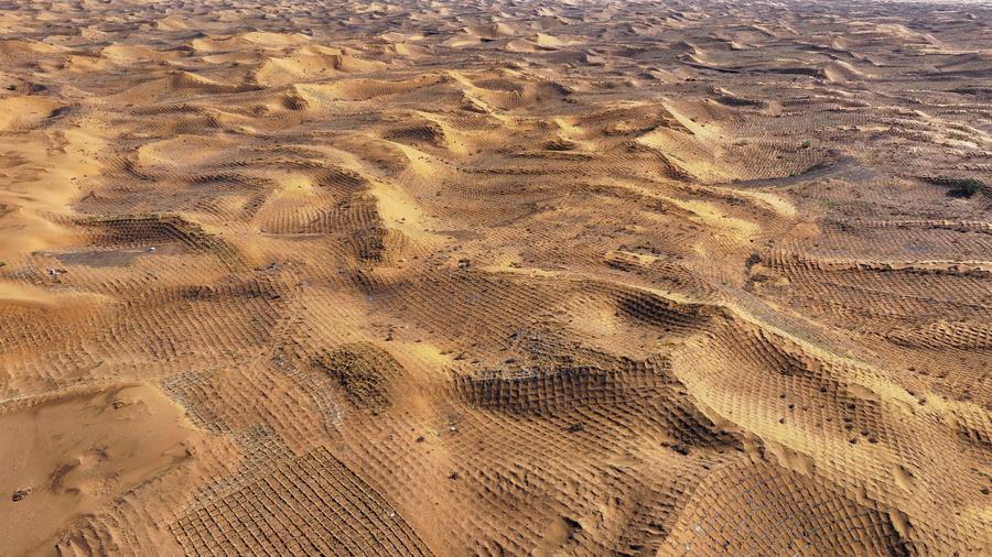 An aerial drone photo taken on May 30, 2024 shows straw checkerboards paved in the Tengger Desert in Zhongwei City, northwest China's Ningxia Hui Autonomous Region. (Xinhua/Feng Kaihua)