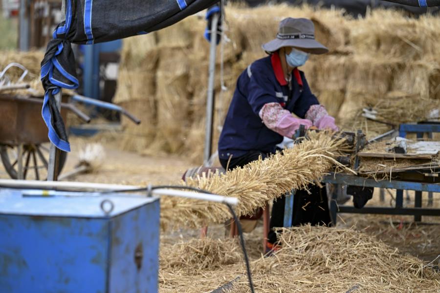 A worker uses a machine to make brush-like straw cable, the material for an enhanced version of straw checkerboards, in Zhongwei City, northwest China's Ningxia Hui Autonomous Region, May 29, 2024. (Xinhua/Feng Kaihua)