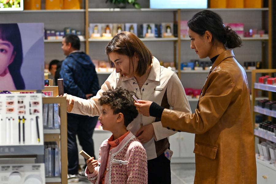 Customers select commodities at the cross-border e-commerce import and export commodities exhibition and trading center in the comprehensive bonded zone in Kashgar Prefecture, northwest China's Xinjiang Uygur Autonomous Region, Nov. 4, 2023. (Xinhua/Ding Lei)