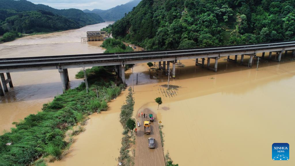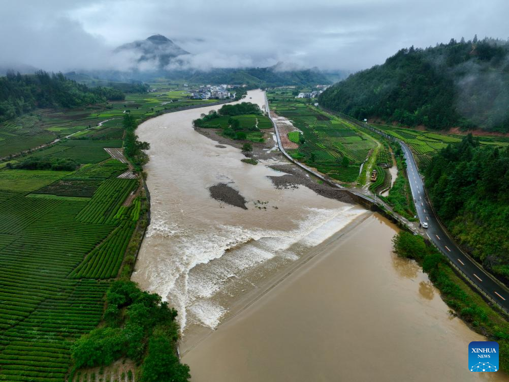 An aerial drone photo taken on June 16, 2024 shows a flooded area in Dongping Township of Zhenghe County, Nanping City, southeast China's Fujian Province.