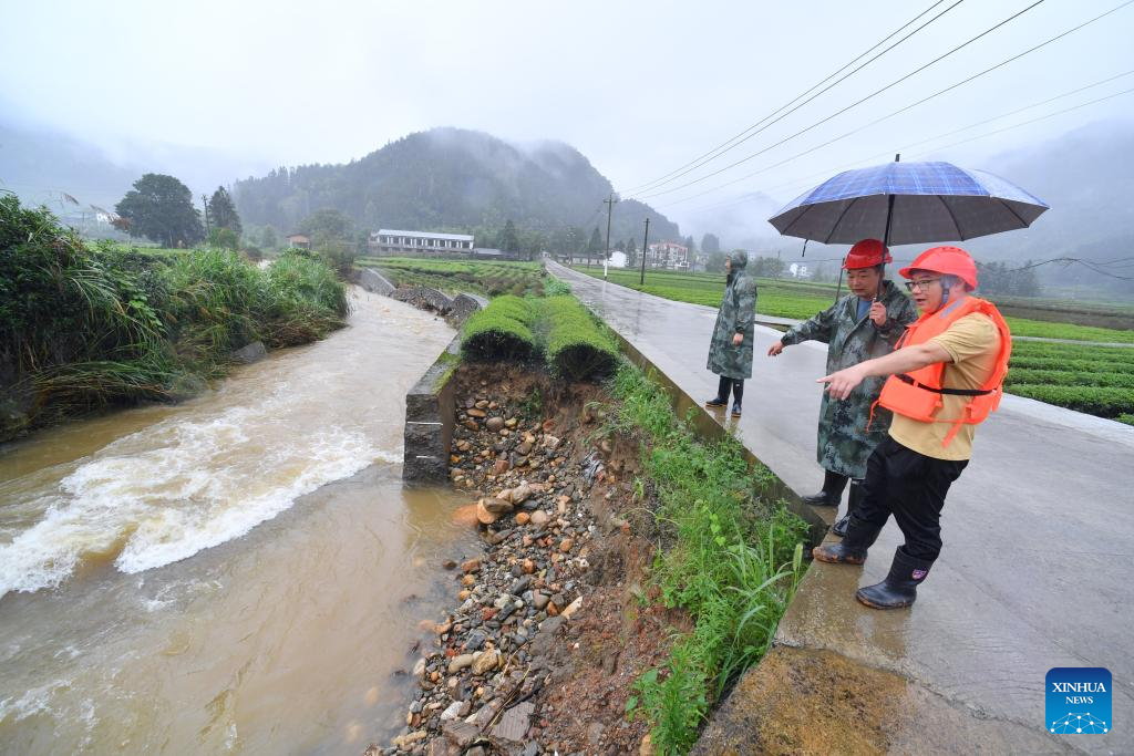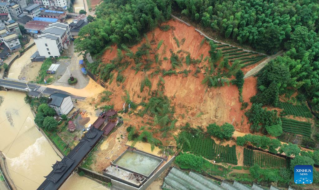 Rescuers inspect a damaged tea garden in Hongxing Village of Xingcun Township in Wuyishan, Nanping City, southeast China's Fujian Province, June 16, 2024.