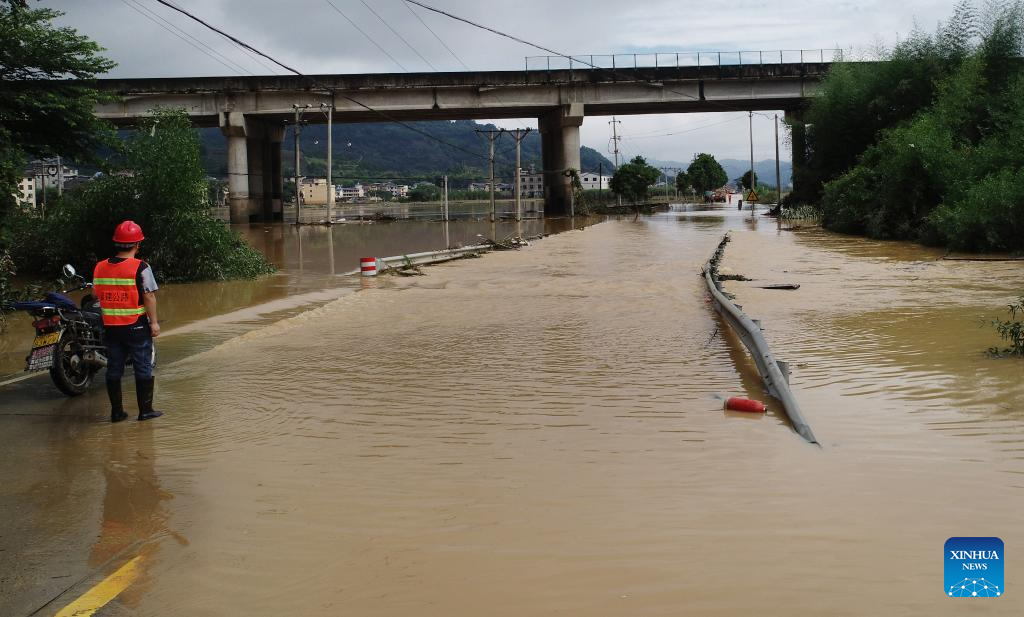 Rescuers inspect the flood in Hongxing Village of Xingcun Township in Wuyishan, Nanping City, southeast China's Fujian Province, June 16, 2024.